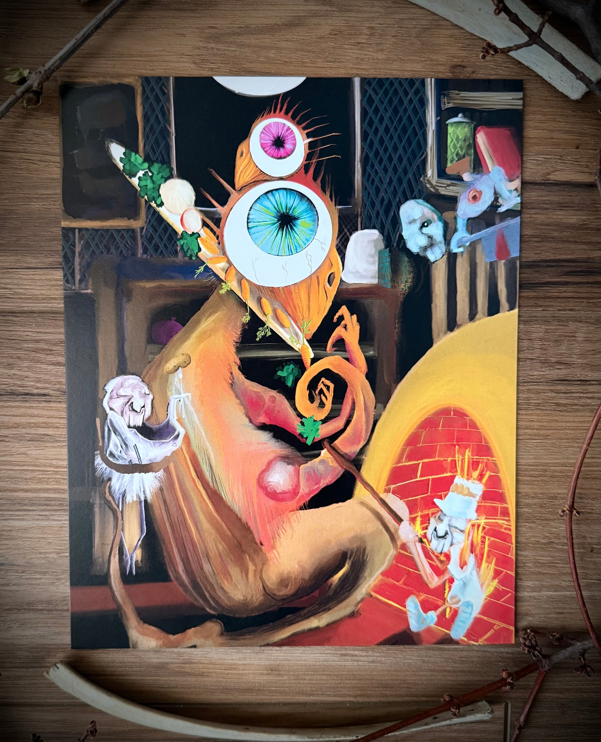 Transform your space with "Bird Banquet," a surreal and imaginative digital painting that captures the whimsical chaos of a culinary adventure. This eye-catching artwork features a quirky, anthropomorphic bird creature adorned with vibrant, multi-colored eyes and a staff of vegetables, preparing a feast in a dreamlike kitchen. A fiery, sentient oven adds to the surreal charm, while smaller whimsical details fill the scene with life and humor. Perfect for fans of surrealism, fantasy, and unique storytelling, this high-quality art print makes a bold and captivating statement in any room or collection.