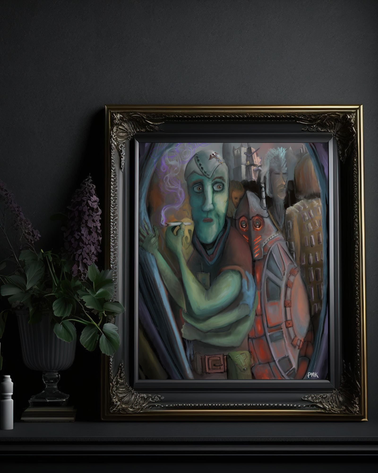 My original art printed on light cardstock and packaged in a protective sleeve with firm backing.